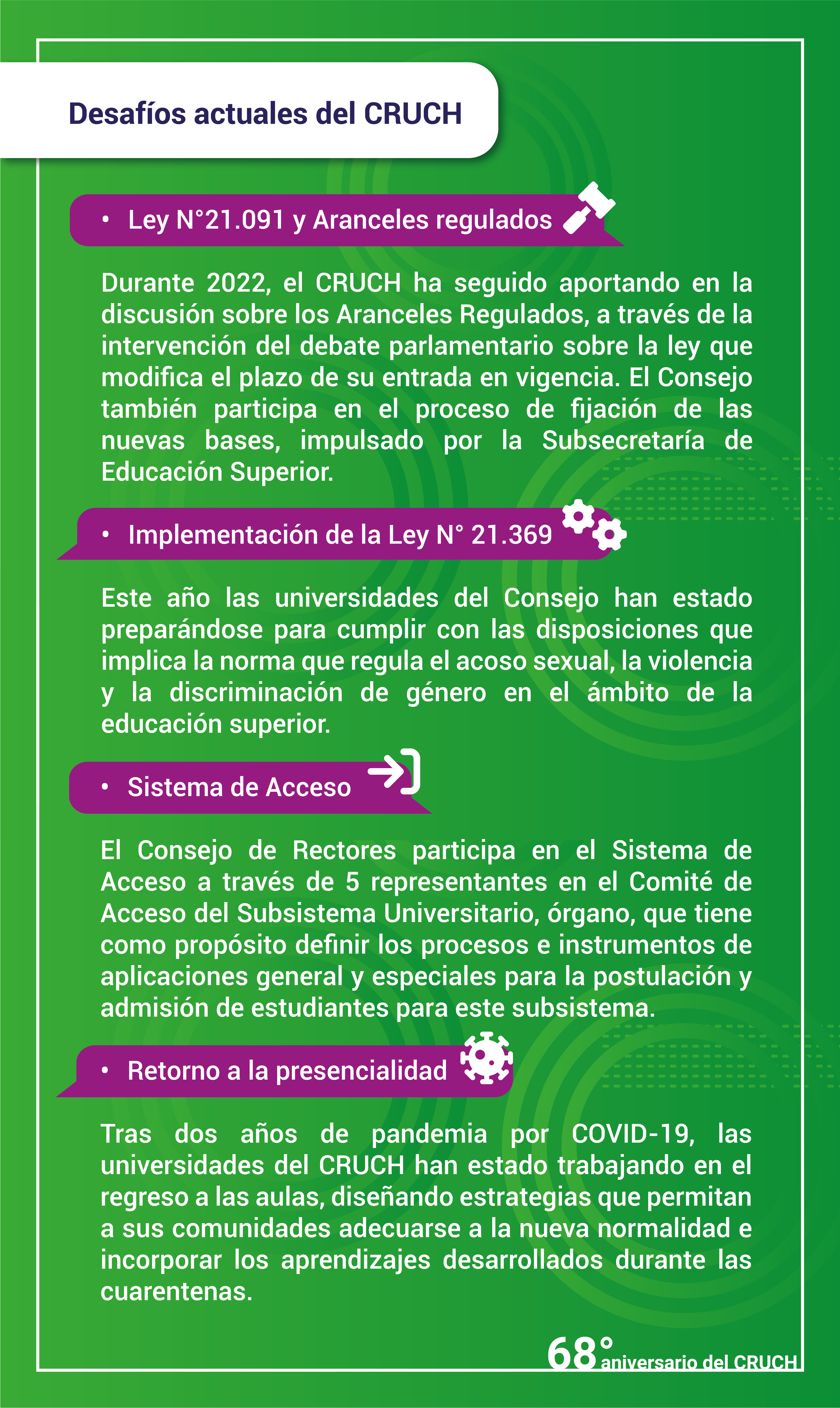 El ministro de Ciencia, Tecnología, Conocimiento e Innovación, Flavio Salazar, también relevó las contribuciones de la institución y sus universidades. “En 68 años han hecho un aporte enorme al desarrollo de nuestro país, generando conocimiento y formando a nuevas generaciones de profesionales (…) El gobierno está abierto a todo el apoyo que pueda recibir del CRUCH para la construcción de un país más equitativo, sustentable y armónico”.