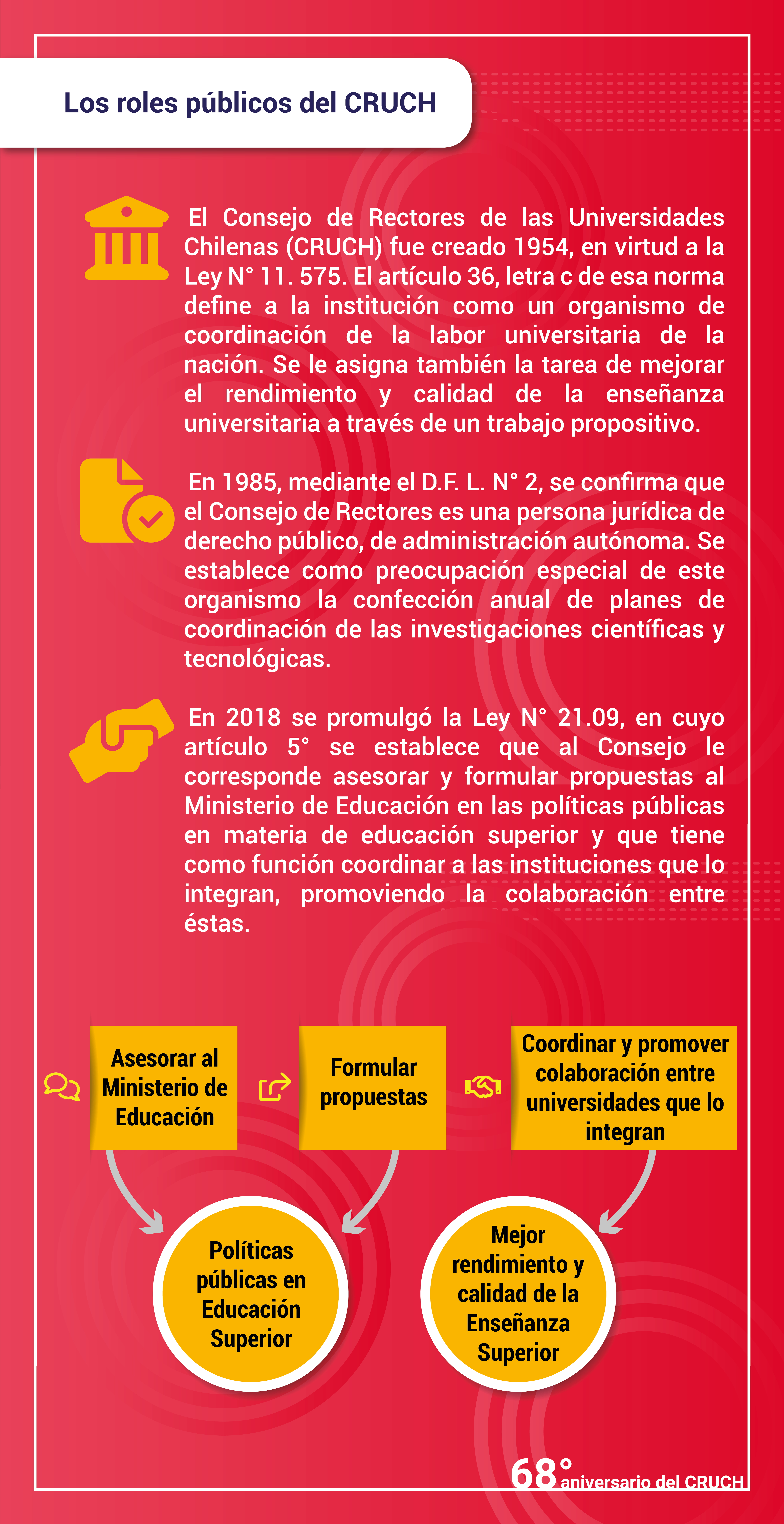 “Esta institución ha tenido un rol protagónico en el diseño e implementación de las políticas públicas vinculadas al desarrollo de la educación superior”, aseguró el vicepresidente ejecutivo del Consejo de Rectores y Rectoras de las Universidades Chilenas, Emilio Rodríguez (U. de Tarapacá), al hacer un balance de los 68 años del CRUCH.