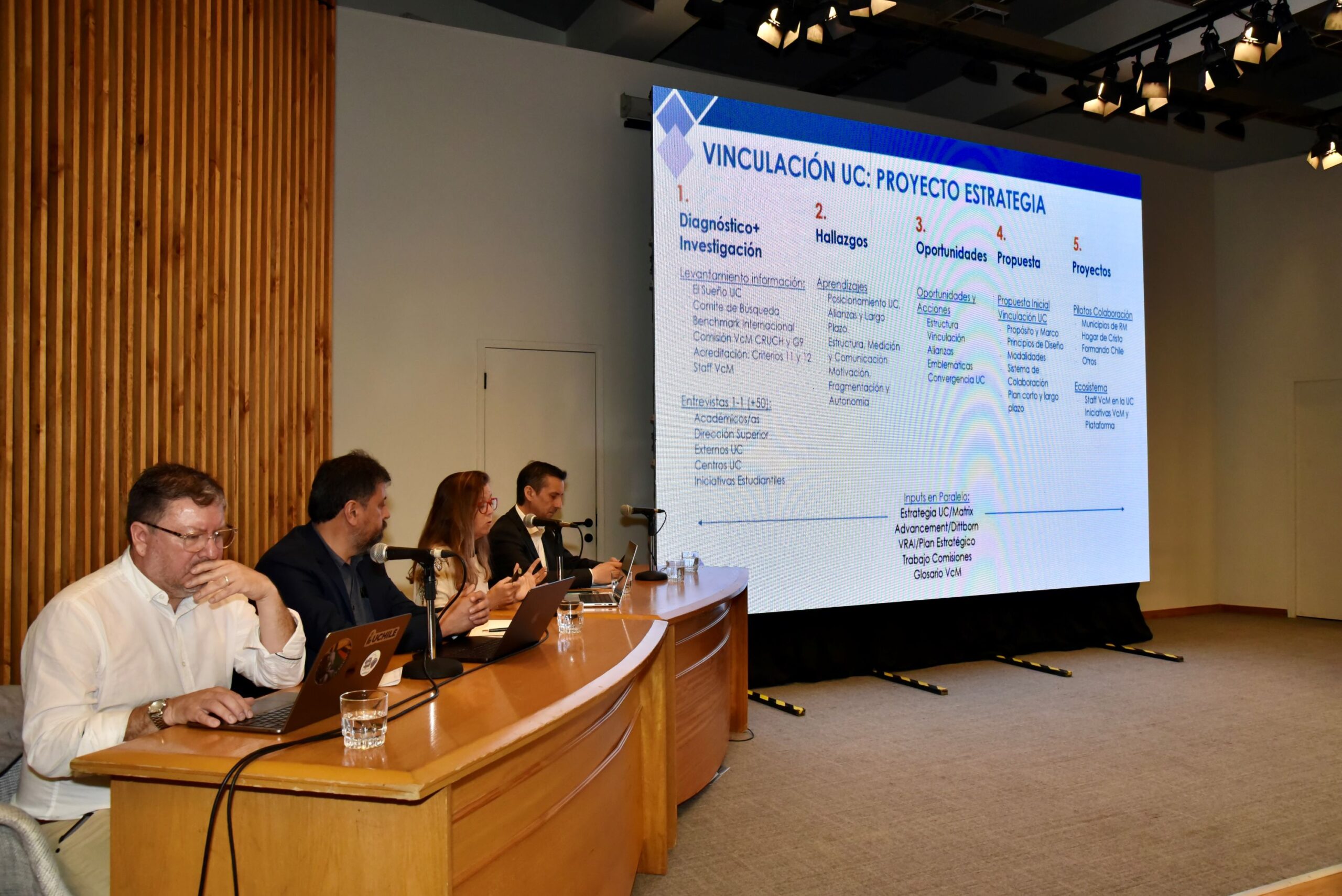 En el primer panel, se presentaron las experiencias de cuatro universidades: la representante de la Pontificia Universidad Católica (UC), Francisca Barros, expuso el «Proyecto Estrategia Vinculación con el Medio UC»; de la Universidad Austral de Chile (UACH), Guillermo D’Elía, compartió la «Nueva Política de Vinculación con el Medio»; de la Universidad de Chile (UChile), Fabián Retamal, socializó la «Estrategia de retroalimentación de las actividades de extensión»; y de la Universidad Católica de Temuco (UCT), Enrique Riquelme, se refirió a la «Experiencia de vinculación UCT con el sector Pedro de Valdivia de Temuco».